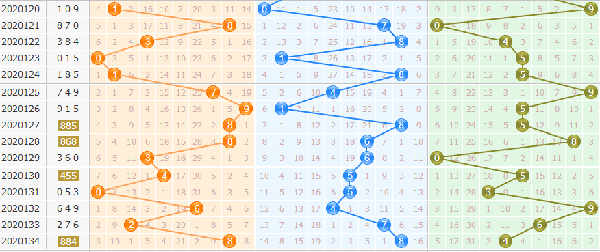 和值预测:上期和值开出20,上期开出大号和值,近期和值出号位置比较靠右,后期预计出号位置会大幅度左移,看好和值走小,本期建议重点推荐本期和值范围:10 11 15 16 17