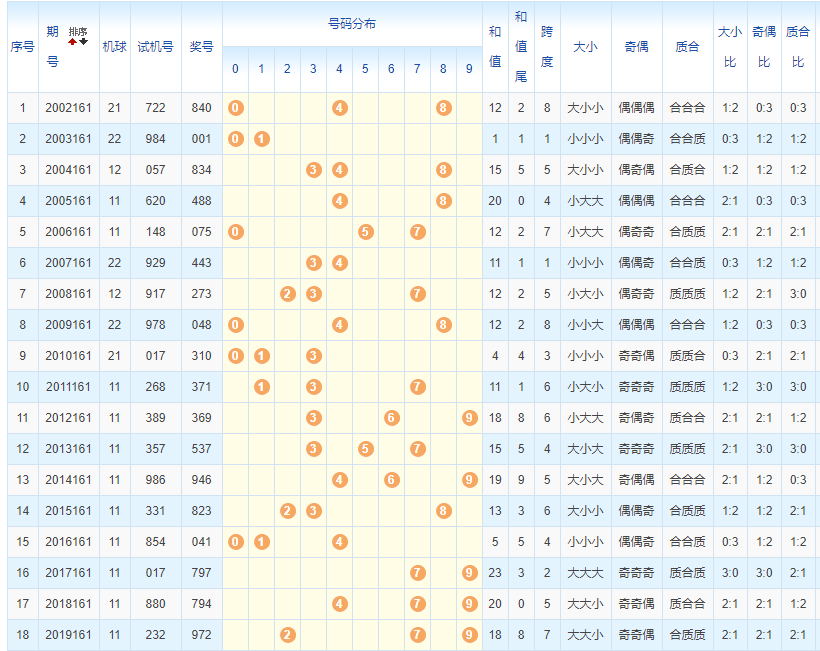 和尾分析:第161期历史同期开奖中,和尾奇偶比为9:9,大小比为6:12,012路比为5:4:9,本期看好开出奇数小数和尾,精选和尾1。