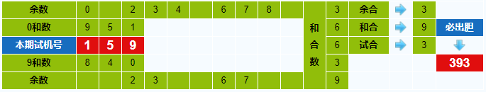 本期3d试机号开出的号码是159,胆码计算器开出的号码是393,重合一个号码9。结合近期试机号命中开奖号走势图来看,近期试机号的命中几率有攀升的迹象,已经连续三期出现了命中的试机号。5号球目前连续两期都在试机号中出现,本期可着重留意一下这个号码。