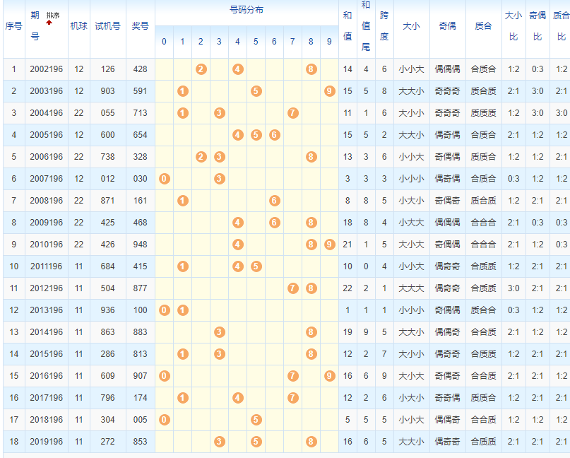 福彩3D从2002年开奖至今已开出了6630期奖号了,本期为2020年第196期开奖,历史上第196期已开出18次奖号了: