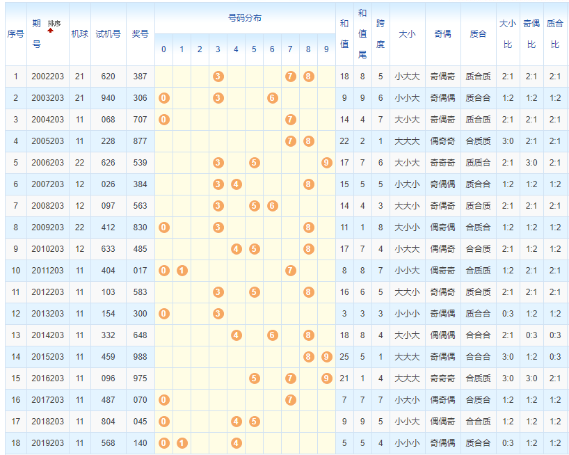 福彩3D从2002年开奖至今已开出了6637期奖号了,本期为2020年第203期开奖,历史上第203期已开出18次奖号了: