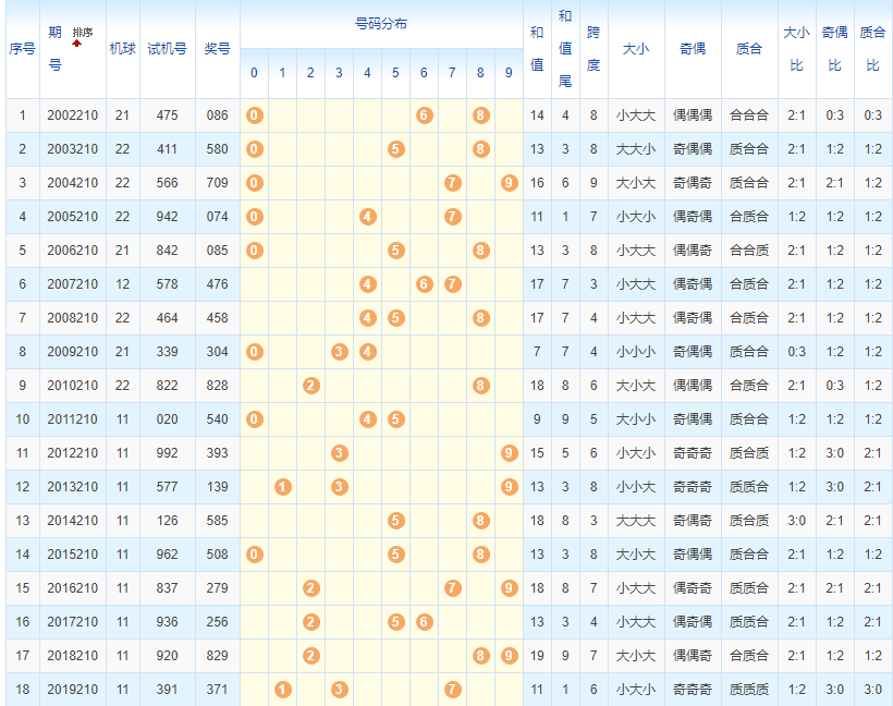 奇偶分析:在第210期历史同期开奖中,号码奇偶比1:2出现10次,0:3出现2次,2:1出现3次,3:0出现3次,其中奇偶比总比例为25:29,偶数稍稍走高,本期看好奇数热出,注意奇偶比2:1。