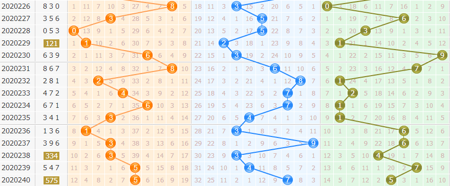 和值分析:上期和值开出17,目前和值连续开出两期大号和值,后期预计出号和值会小幅度左移,本期建议重点关注和值范围:11—19
