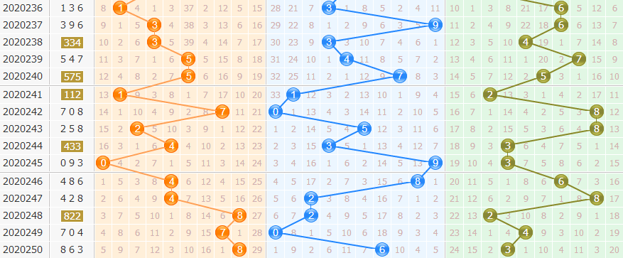 跨度分析:上期跨度开出05,大跨度连续开出四期,后期预计出号跨度变动不大,建议大家可以重点关注小跨度号码出现,苏会文本期参考号码走势分析,重点推荐跨度范围:2—7