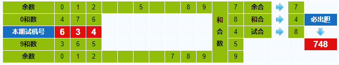 本期3d试机号开出的号码是634,胆码计算器开出的号码是748,重合了一个4号码,。结合近期试机号命中开奖号走势图来看,试机号的命中几率还是比价欧高的,近五期都有连续的命中。其中试机号4近期出现非常频繁,并且在开奖号中也是一个较有势头的号码,本期建议重点关注4号球。