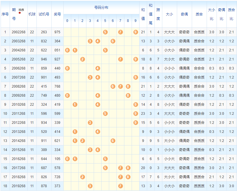 类型分析:在第268期历史同期开奖中,18期里有6期开出了组三,剩下的都是组六。开出组三的分别是2006268期、2011268期、2012268期、2013268期、2015268期、2019268期,剩下的都是组六。从整体来看,组三开出同号的概率还是比较高的,本期看好组三的开出。