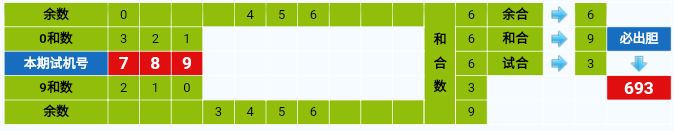 本期3d试机号开出的号码是789,胆码计算器开出的号码是693,重合一个号码9。结合近期试机号命中开奖号走势图来看,近期试机号命中开奖号的几率还算比较可观,虽然上几期出现连续三期没有命中的情况,但是上期紧接着命中一码。从近十期命中的号码来看,1路号码被击中的概率稍大,本期试机号中7号球属于1路号码,而且为本期重复号,可以着重关注一下。