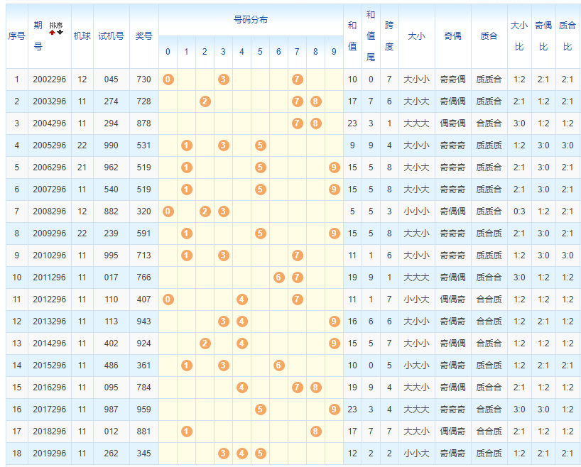 福彩3D从2002年开奖至今已开出了6728期奖号了,本期为2020年第296期开奖,历史上第296期已开出18次奖号了: