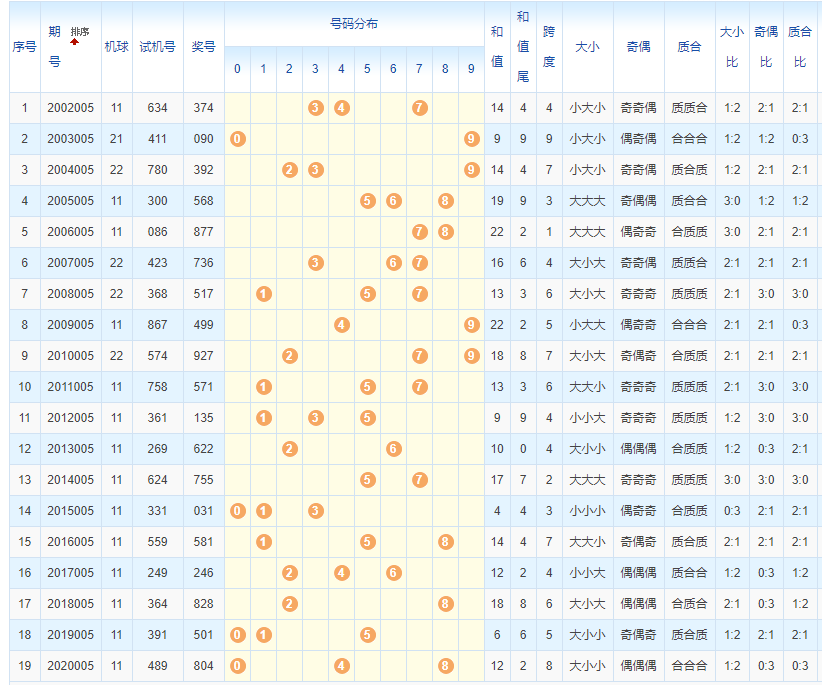 福彩3D从2002年开奖至今已开出了4期奖号了,本期为2020年第005期开奖,历史上第005期已开出18次奖号了: