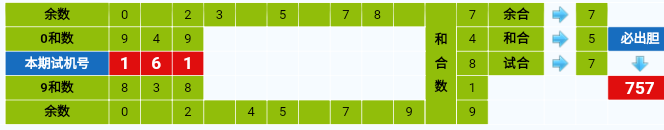 本期3d试机号开出的号码是161,胆码计算器开出的号码是757,没有重合的号码。结合近期试机号命中开奖号走势图来看,近期试机号频繁命中开奖号,鲜少有空缺,可见本期试机号号码还是值得关注的。尤其是本期试机号中以对子形式出现的6号球,建议着重关注一下。