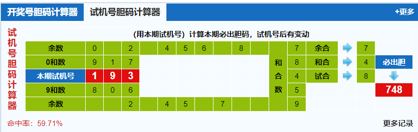 本期试机号胆码计算器推荐胆码:193