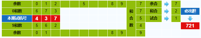 本期3d试机号开出的号码是437,胆码计算器开出的号码是721,重合一个号码7。结合近期试机号命中开奖号走势图来看,7号球在近二十期中以试机号出现的次数非常多,并且目前为两期连开的重复号,而且近期开奖号中重复号出现的概率也非常的大,本期看好试机号7命中开奖号。