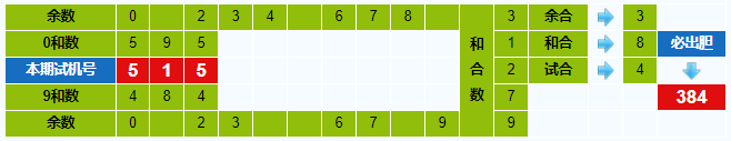 本期3d试机号开出的号码是515,胆码计算器开出的号码是384,没有重合的号码。结合近期试机号命中开奖号走势图来看,近期试机号的命中概率比较大,上期命中了两个号码。5号球是本期重复号,上两期也有出现在试机号的记录,近期可能会又一波升温,本期建议小防5号球。