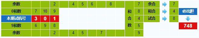 本期3d试机号开出的号码是301,胆码计算器开出的号码是748,没有重合的号码。结合近期试机号命中开奖号走势图来看,近期试机号的连续命中几率走高的趋势非常明显,目前已经连续四期命中了,势不可挡。在本期试机号中的3号球为本期隔期号,并且近期热度上升显著,本期有较高概率出现命中情况,建议着重关注3号球。
