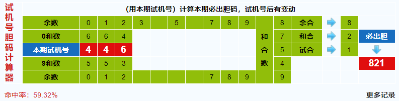 上期号码开出了432,本期试机号开出446,试机号胆码计算器开出821。结合试机号走势来看,2号球和4号球是上期开奖号,属于重号,走势较热,近期重号开出也不错,很有可能会连开,可以关注;1号球属于邻码,近期邻码出号稳定,活跃度较好,可以留意;6号球隔了两期,8号球隔了3期,走势都趋温,也都属于偶数,有开出的潜力,可以期待。
