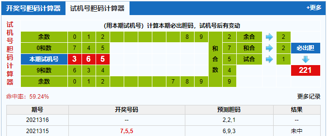 本期3d试机号胆码计算器给出结果:221