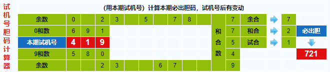 今日3d试机号的开奖号码是419,试机号胆码计算器开出看721,从试机号跟胆码计算器的开奖号来看,都有一个1号球,1号球目前是隔了1期,本期是一个邻码,本期需要关注;2号球是一个冷号,目前是遗漏了12期了,本期开出的概率不大;4号球目前是隔了3期,近期的4号球隔期数在缩短,本期需要关注;7号球跟9号球都是上期的开奖号码,重复号本期需要关注一下。