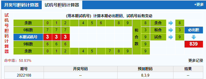 本期3d试机号胆码计算器给出结果839