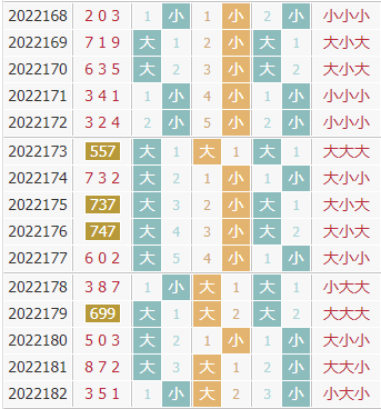上期开出了号码351,组六类型,奇奇奇,小大小形态,和值9,跨度4。在大小走势上,近10期出现0次全小,2次全大,4次两大一小,4次两小一大,大数占比更多,但是走势上近期是大数走热,预计大数会继续开出,本期关注大数。
