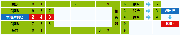 本期试机号开出的类型为组六,胆码计算器给出的类型组六,类型一致。上期开出的号码为组六类型,本期看好继续以组六开出。