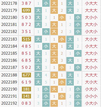 上期开出了号码083,组六类型,偶偶奇,小大小形态,和值11,跨度8。在大小走势上,近10期出现1次全小,2次全大,4次两大一小,3次两小一大,大数占比更多,但是走势上近3期是小数走热,预计小数会继续开出,本期关注小数。