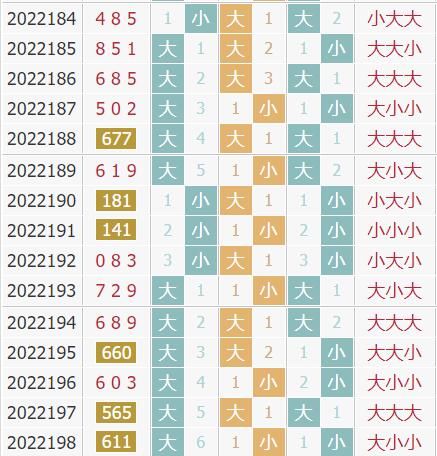 上期开出了号码611,组三类型,偶奇奇,大小小形态,和值8,跨度5。在大小走势上,近10期出现1次全小,5次全大,3次两大一小,7次两小一大,大数数量占比更多,但是走势上近期是大数走热,预计大数会继续开出,本期关注大数。