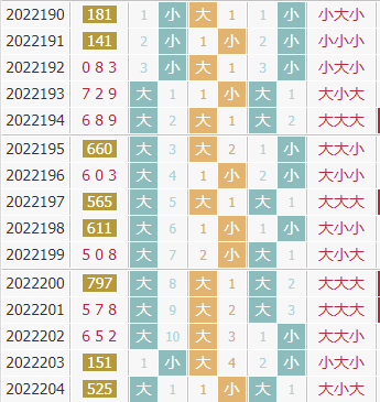 上期开出了号码525,组三类型,奇偶奇,大小大形态,和值12,跨度3。在大小走势上,近10期出现0次全小,3次全大,4次两大一小,3次两小一大,大数占比更多,走势上近期是大数走热,预计大数会继续开出,本期关注大数。
