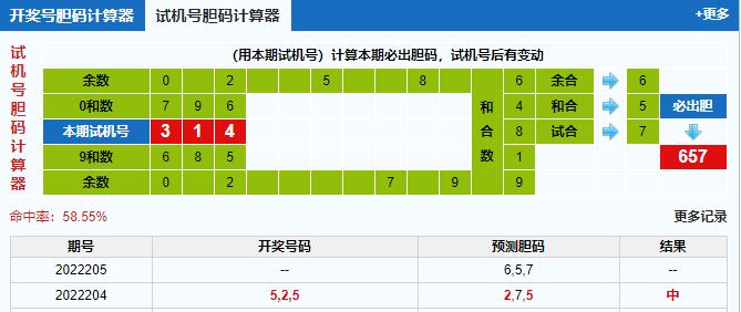 胆码计算器的结果是657,5号球是连续开出了四次的号码,近期的5号球走势过热,不看好5号球的继续出号;6号球是遗漏了2期的号码,前期6号球的热度较高,近期还是有余温的,可以注意6号球的开出;7号球是遗漏了3期的号码,近期7号球的势力不强,但是7号球走势还是比较稳定的,可以关注7号球的开出。