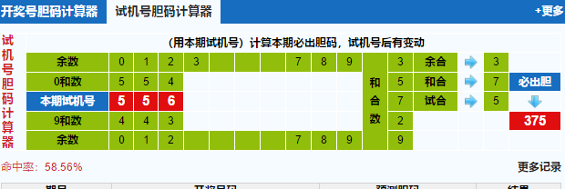 结合试机号胆码计算器来看,3号球上期连着已经有三期开出了,本期也要看好3号球的表现;7号球目前还是升温,小间隔开出居多,看好7号球;5号球就是一个冷号了,不过冷号回暖的可能性很大,也要重点关注。