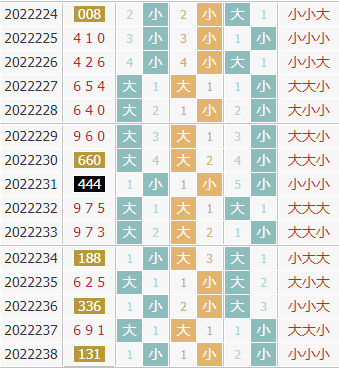上期开出了号码131,组三类型,奇奇奇,小小小形态,和值5,跨度1。在大小走势上,近10期出现2次全小,1次全大,6次两大一小,1次两小一大,大数占比更多,但是走势上近期是大数走热,预计小数会展开反击,本期关注小 数。