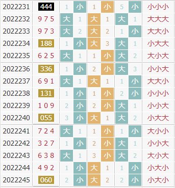 上期开出了号码060,组三类型,偶偶偶,小大小形态,和值6,跨度6。在大小走势上,近10期出现1次全小,0次全大,3次两大一小,6次两小一大,小数占比更多,但是走势上近期是小数走热,预计小数会继续开出,本期关注小数。