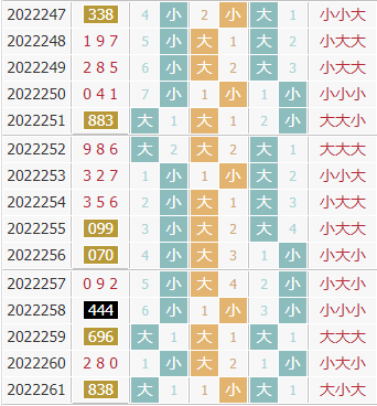 上期开出了号码838,组三类型,偶奇偶,大小大形态,和值19,跨度5。在大小走势上,近10期出现1次全小,2次全大,3次两大一小,4次两小一大,大数占比更多,但是走势上近5期是小数走热,预计小数会继续开出,本期关注小数。