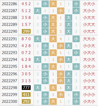 上期开出了号码292,组三类型,偶奇偶,小大小形态,和值13,跨度7。在大小走势上,近10期出现1次全小,1次全大,2次两大一小,6次两小一大,小数占比更多,但是走势上近期是小数走热,预计小数会继续开出,本期关注小数。