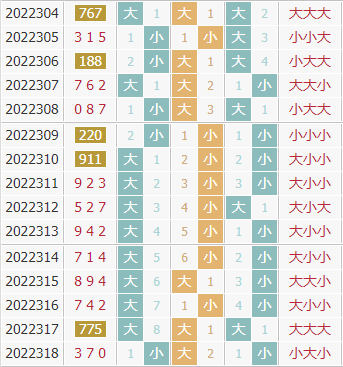 上期开出了号码370,组六类型,奇奇偶,小大小形态,和值10,跨度7。在大小走势上,近10期出现1次全小,1次全大,2次两大一小,6次两小一大,小数占比更多,但是走势上近期是小数走热,预计大数会进行反击,本期关注大数。