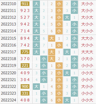 上期开出了号码408,组六类型,偶偶偶,小小大形态,和值12,跨度8。在大小走势上,近10期出现3次全小,1次全大,1次两大一小,5次两小一大,小数占比更多,但是走势上近期是小数走热,预计小数会继续开出,本期关注小数。