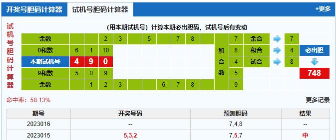 胆码计算器的结果是748,7号球是遗漏了2期的号码,近10期的7号球开出走势较热,可以看好7号球的开出;8号球是遗漏了2期的号码,近期的8号球开出热度高,可以看好8号球的开出。