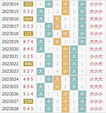 上期开出了号码043,组六类型,偶偶奇,小小小形态,和值7,跨度4。在大小走势上,近10期里全大开出了1期,2大1小开出了4期,1大2小开出了3期,全小开出了2期,小数占比更多,但是走势上近期是小数走热,预计小数会继续开出,本期关注小数。