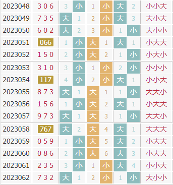 上期开出了号码732,组六类型,奇奇偶,大小小形态,和值12,跨度5。在大小走势上,近10期出现1次全小,1次全大,5次两大一小,3次两小一大,大数占比更多,走势上近期也是大数走热,预计大数会继续开出,本期关注大数。