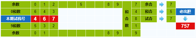 本期3d试机号开出的号码是467,胆码计算器开出的号码是757,重合一个7号球。结合近期试机号命中开奖号走势图来看,近期试机号的命中几率非常高,一路飙升,并且还有走高的趋势。近十五期中仅有两期没有命中,目前连续命中七期,上期更是三码全部命中。可见近期试机号的参考价值极高,本期不能忽视试机号三码。