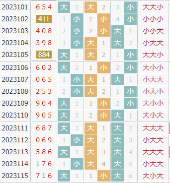 上期开出了号码716,组六类型,奇奇偶,大小大形态,和值14,跨度6。在大小走势上,近10期里全大开出了2期,2大1小开出了5期,1大2小开出了3期,全小开出了0期,大数占比更多,但是走势上近期是大数走热,预计大数会继续开出,本期关注大数。