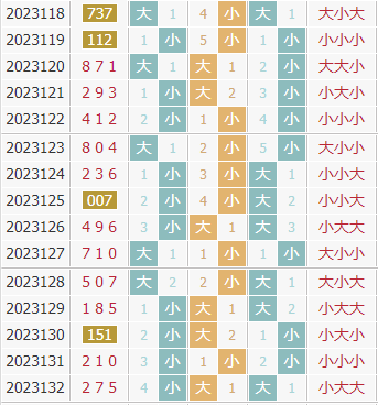 上期开出了号码275,组六类型,偶奇奇,小大大形态,和值14,跨度5。在大小走势上,近10期出现1次全小,0次全大,4次两大一小,5次两小一大,小数占比更多,但是走势上近期是大数走热,预计的数会继续开出,本期关注大数。
