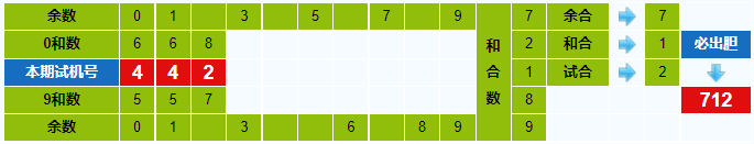本期3d试机号开出的号码是442,胆码计算器开出的号码是712,重合了一个2号球。结合近期试机号命中开奖号走势图来看,近期试机号的命中几率有上升的趋势,近五期共命中三次,较再之前的五期有了稍许升高,本期看好试机号连续命中,重合的2号球可以多加关注。