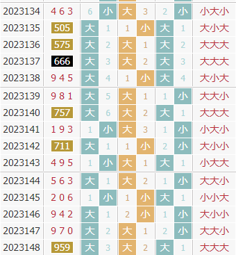 上期开出了号码959,组三类型,奇奇奇,大大大形态,和值23,跨度4。在大小走势上,近10期里全大开出了2期,2大1小开出了4期,1大2小开出了4期,全小开出了0期,大数占比更多,走势上近期是大数走热,预计大数会继续开出,本期关注大数。