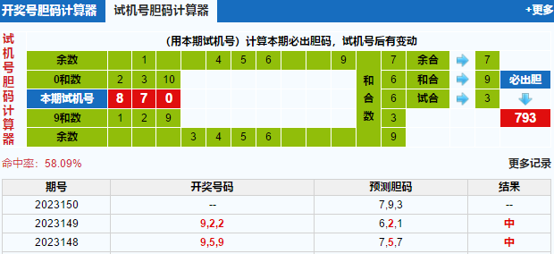 结合试机号胆码计算器来看,7号球也是一个回暖1趋势,继续看好7号球的走热;9号球已经是有四期开出了,连开非常强势,小防9号球继续开出;3号球也是有五期没有开出,近期温号都在陆续回暖,看好3号球的升温。