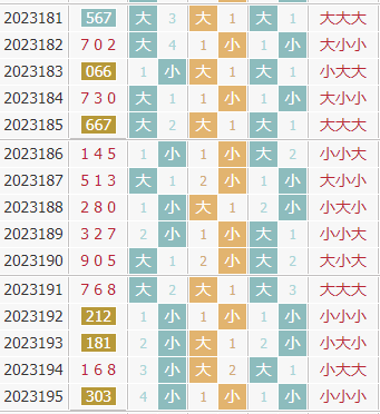 上期开出了号码303,组三类型,奇偶奇,小小小形态,和值6,跨度3。在大小走势上,,近10期里全大开出了1期,2大1小开出了2期,1大2小开出了5期,全小开出了2期,小数占比更多,但是走势上近期是小数走热,预计小数会继续开出,本期关注小数。