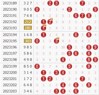 十位出4号,近5期奖号分别遗漏27、7、53、15、0,近5期内十位走势呈现升温解冻的现象,冷号占比较大,热号也时有出现,按照走势规律,预计这种态势下会继续升温,本期偏向冷号3开出,防热号。