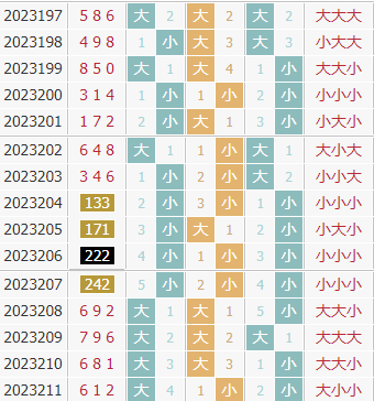 上期开出了号码612,组六类型,偶奇偶,大小小形态,和值9,跨度5。在大小走势上,近10期里全大开出了1期,2大1小开出了3期,1大2小开出了3期,全小开出了3期,小数占比更多,走势上近期是小数走热,预计小数会继续开出,本期关注小数。