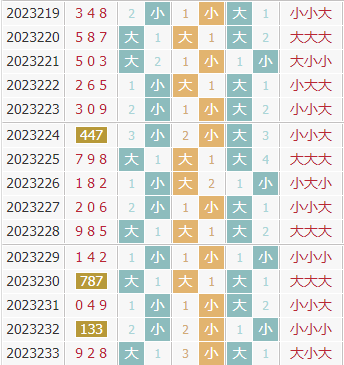 上期开出了号码928,组六类型,奇偶偶,大小大形态,和值19,跨度7,近10期里全大开出了3期,2大1小开出了1期,1大2小开出了4期,全小开出了2期,小数占比更多,但是走势上近期是小数走热,预计小数会继续开出,本期关注小数。
