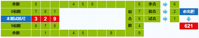 本期3d试机号开出的号码是329,胆码计算器开出的号码是621,重合了一个2号球。结合近期试机号命中开奖号走势图来看,近期试机号处于极速回升的状态中,上五期共命中了四期,本期依旧看好试机号,可以着重关注重合的2号球。
