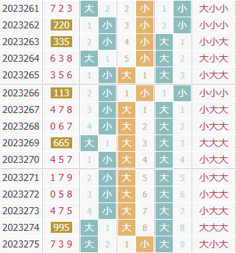 上期开出了号码739,组六类型,奇奇奇,大小大形态,和值19,跨度6。近10期里全大开出了2期,2大1小开出了7期,1大2小开出了0期,全小开出了1期,走势上近期是大数走热,预计小数会反击开出,本期关注小数。